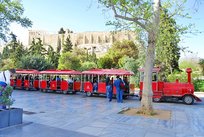 The Athens Happy Train is a toy-like street train that starts its sightseeing tour from the Constitution Square (also known as "Syntagma") and follows an amazing route through the historical center of the city, the old neighborhoods and the hill of Acropolis.